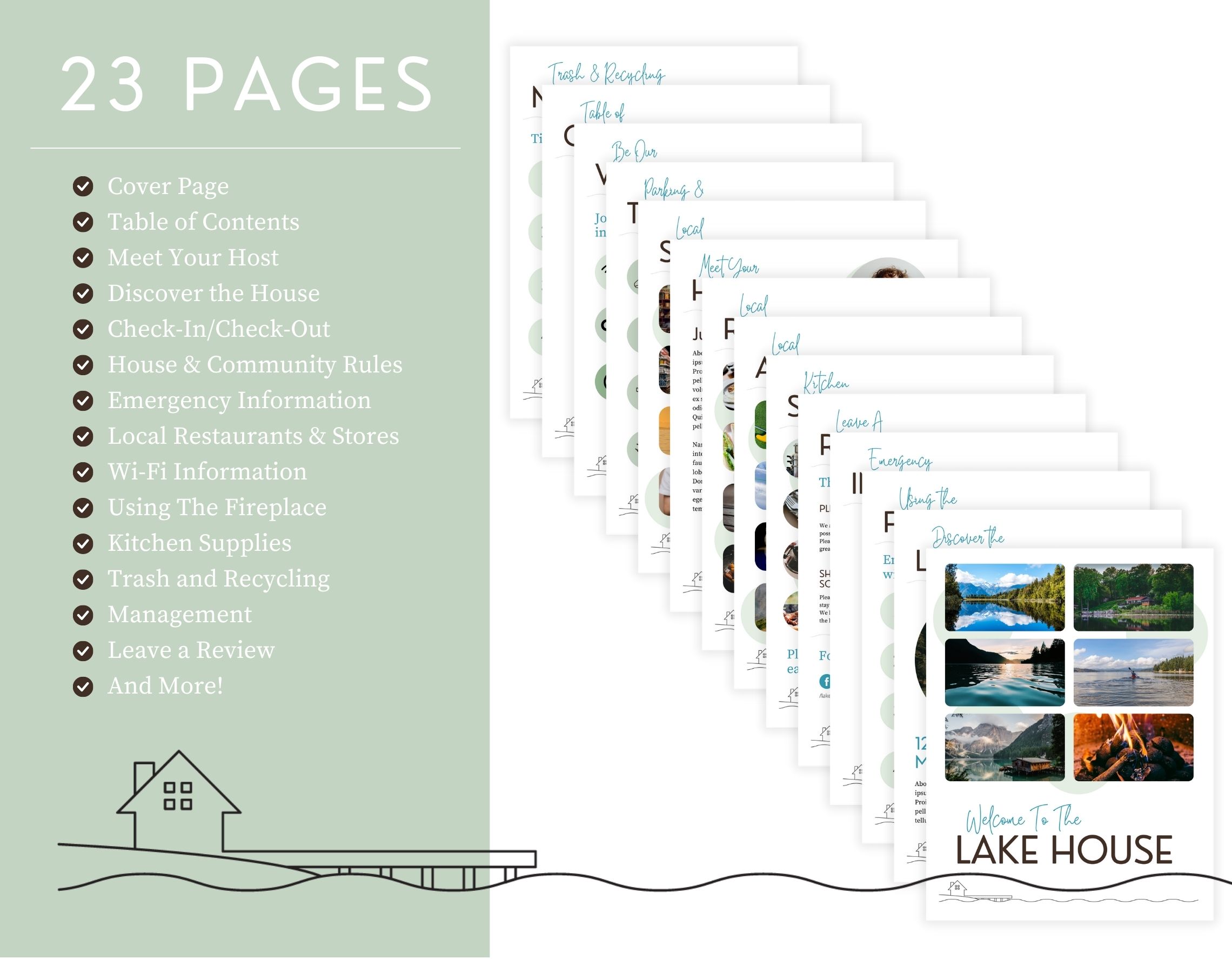 Lake House Welcome Book for your guests and visitors. Customizable Canva Airbnb House Manual template. You can change the colors, images, fonts, text, and more. Customize to fit the style of your Lake House Airbnb property!