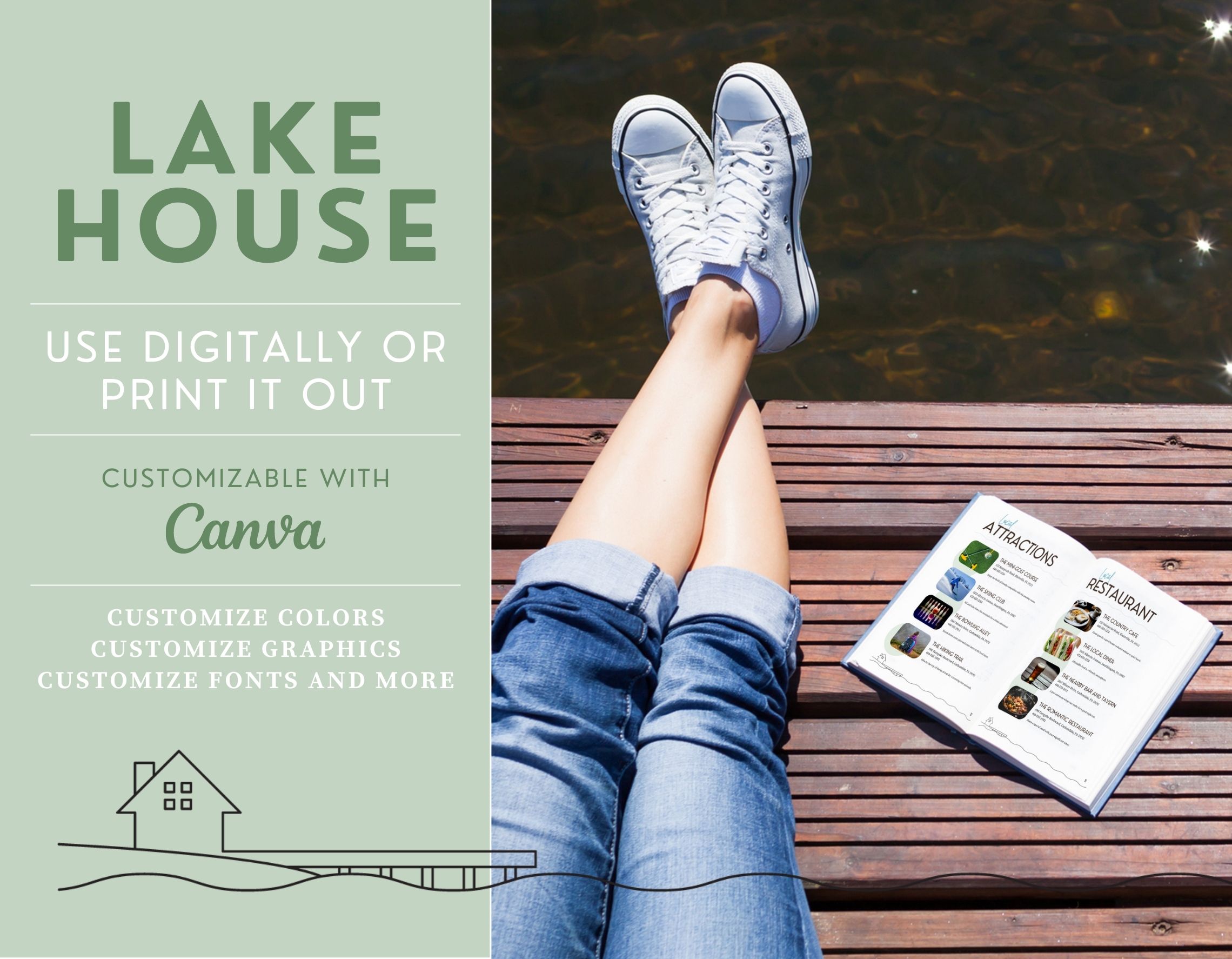 Template for an Airbnb Welcome Book. Lake House Welcome Book for your guests and visitors. Customizable Canva Airbnb House Manual template. You can change the colors, images, fonts, text, and more. Customize to fit the style of your Lake House Airbnb property! The Canva template is accessible via a link once purchased. It works on the Canva website app, mobile app and desktop app.
