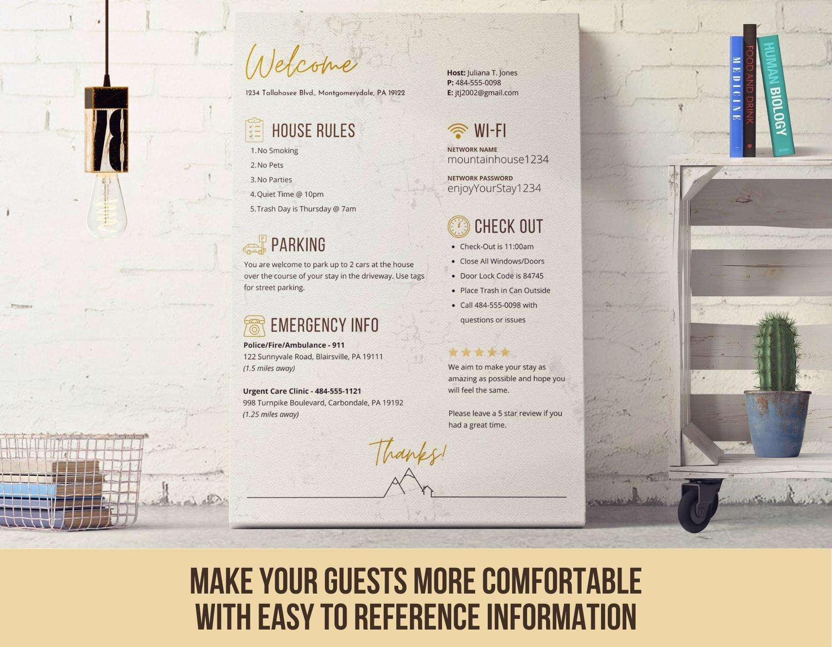 When guests arrive at your mountain house rental property, they have a ton of questions. Give them a simple sign to answer the most common questions, and make their stay a five-star experience! Get our Mountain House Airbnb Welcome Sign template and edit in Canva to make the information fit your property. You can change the colors, images, fonts, text, and more. Customize to fit the style of your Mountain House Airbnb property! The Canva template is accessible via a link once purchased. It works on the Canva website app, mobile app and desktop app.