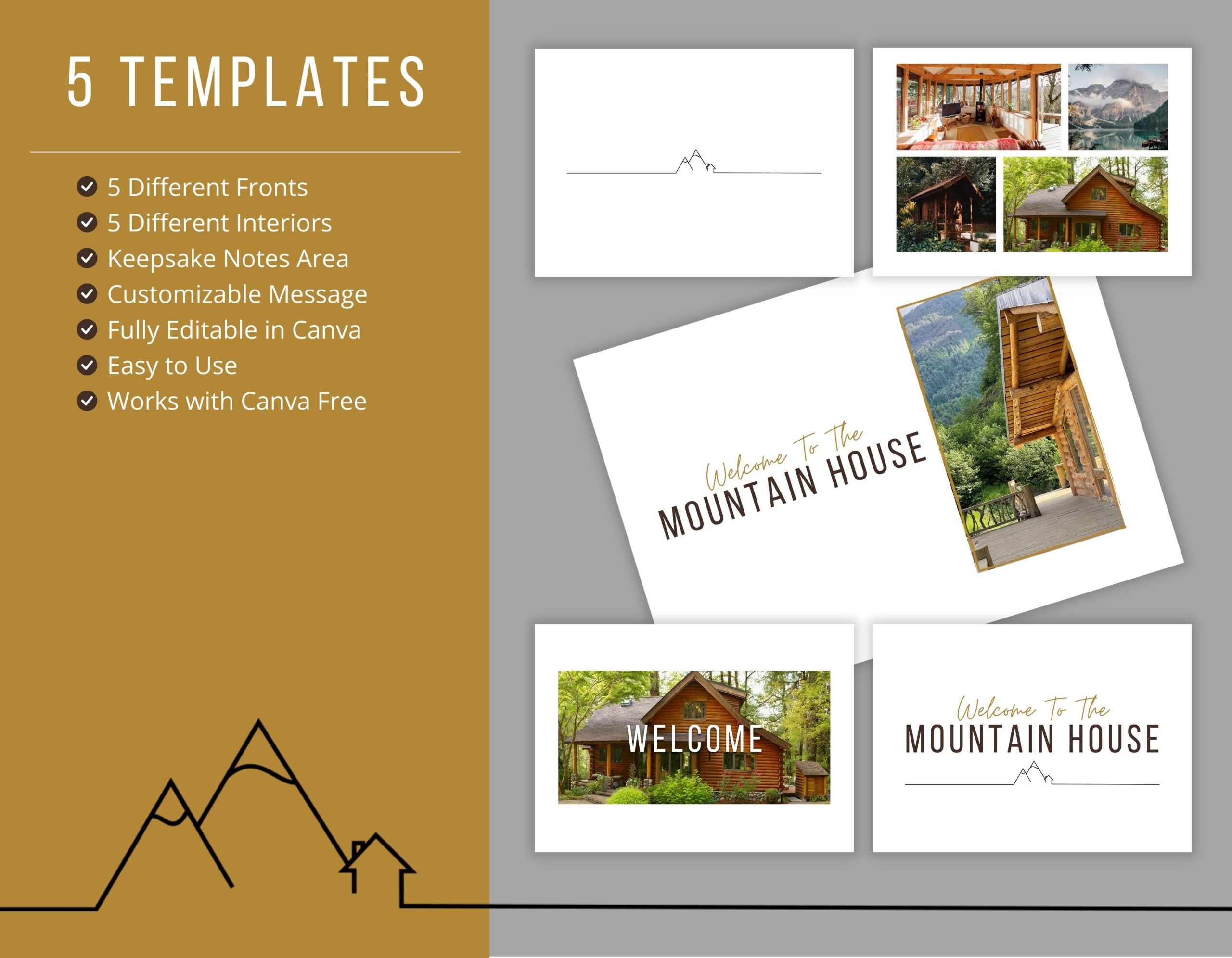 Get our Mountain House Welcome Cards template and edit in Canva to make the information fit your property. You can change the colors, images, fonts, text, and more. Customize to fit the style of your amazing Mountain House Airbnb rental property! The Canva template is accessible via a link once purchased. It works on the Canva website app, mobile app and desktop app.